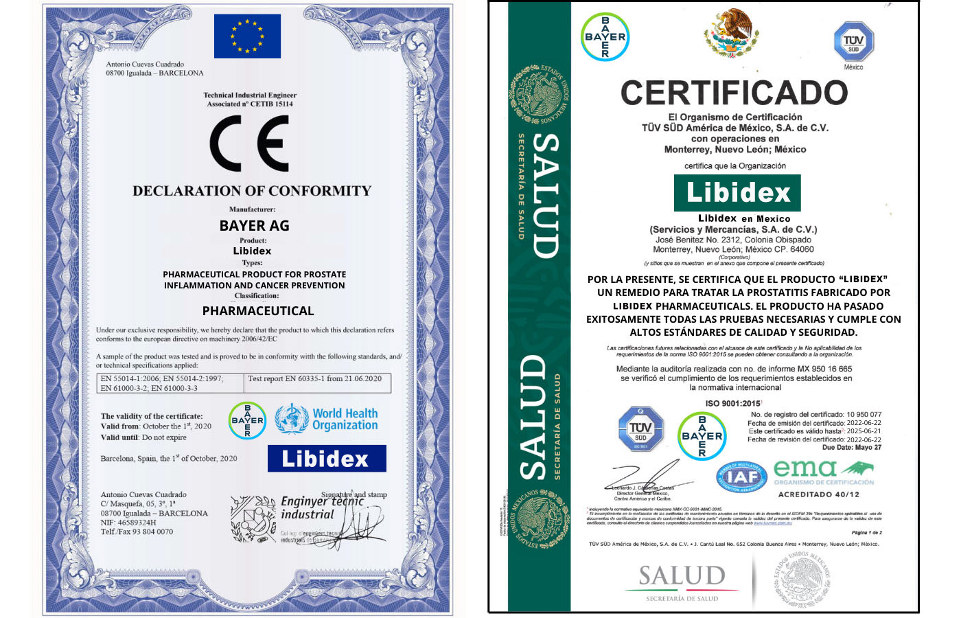 Libidex एक विश्वसनीय विकल्प है और इन दो प्रमाणनों द्वारा समर्थित है, जिससे प्रोस्टेटाइटिस के प्रभावी उपचार की खोज करने वाले मरीजों को शांति मिलती है।